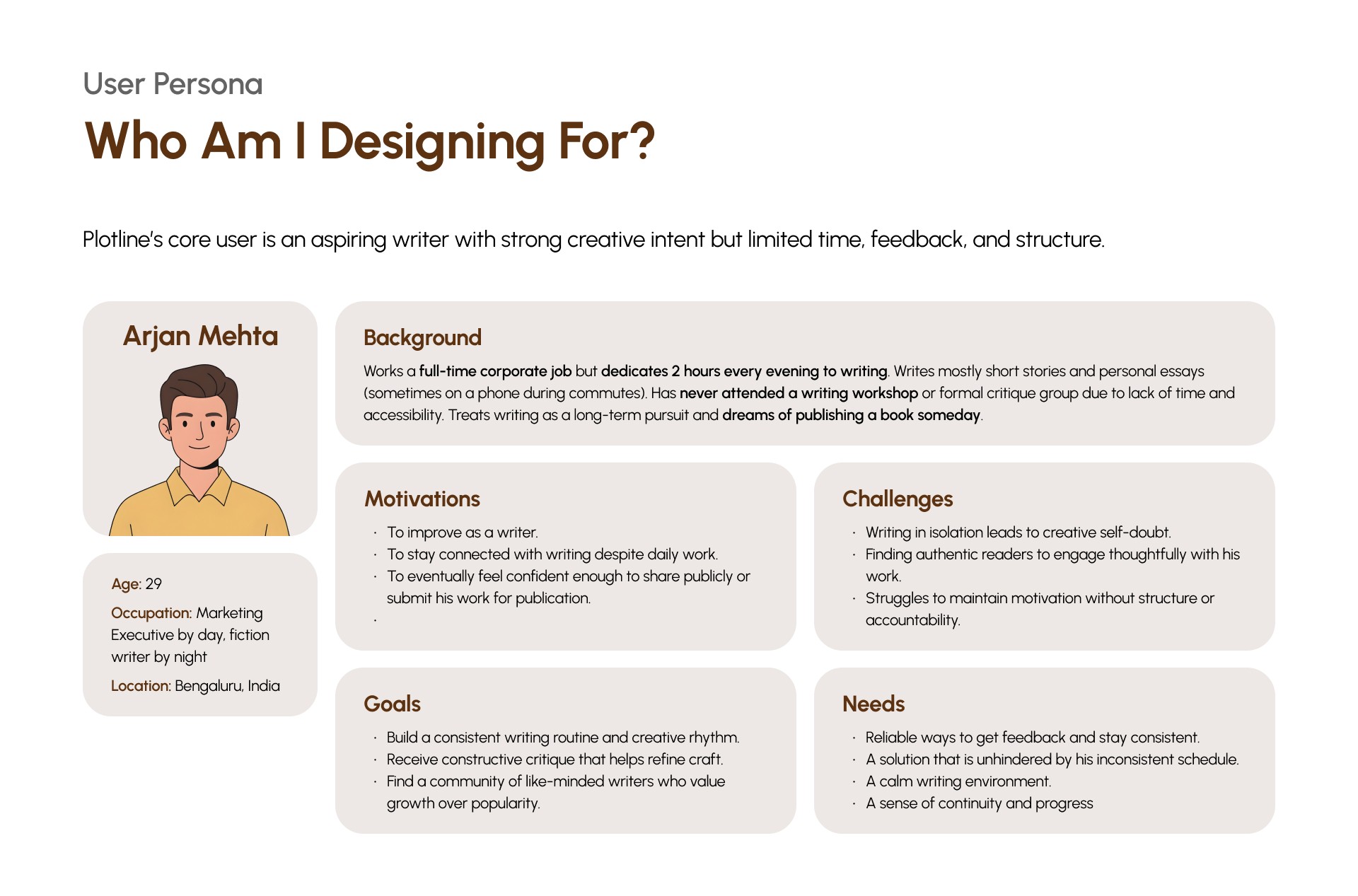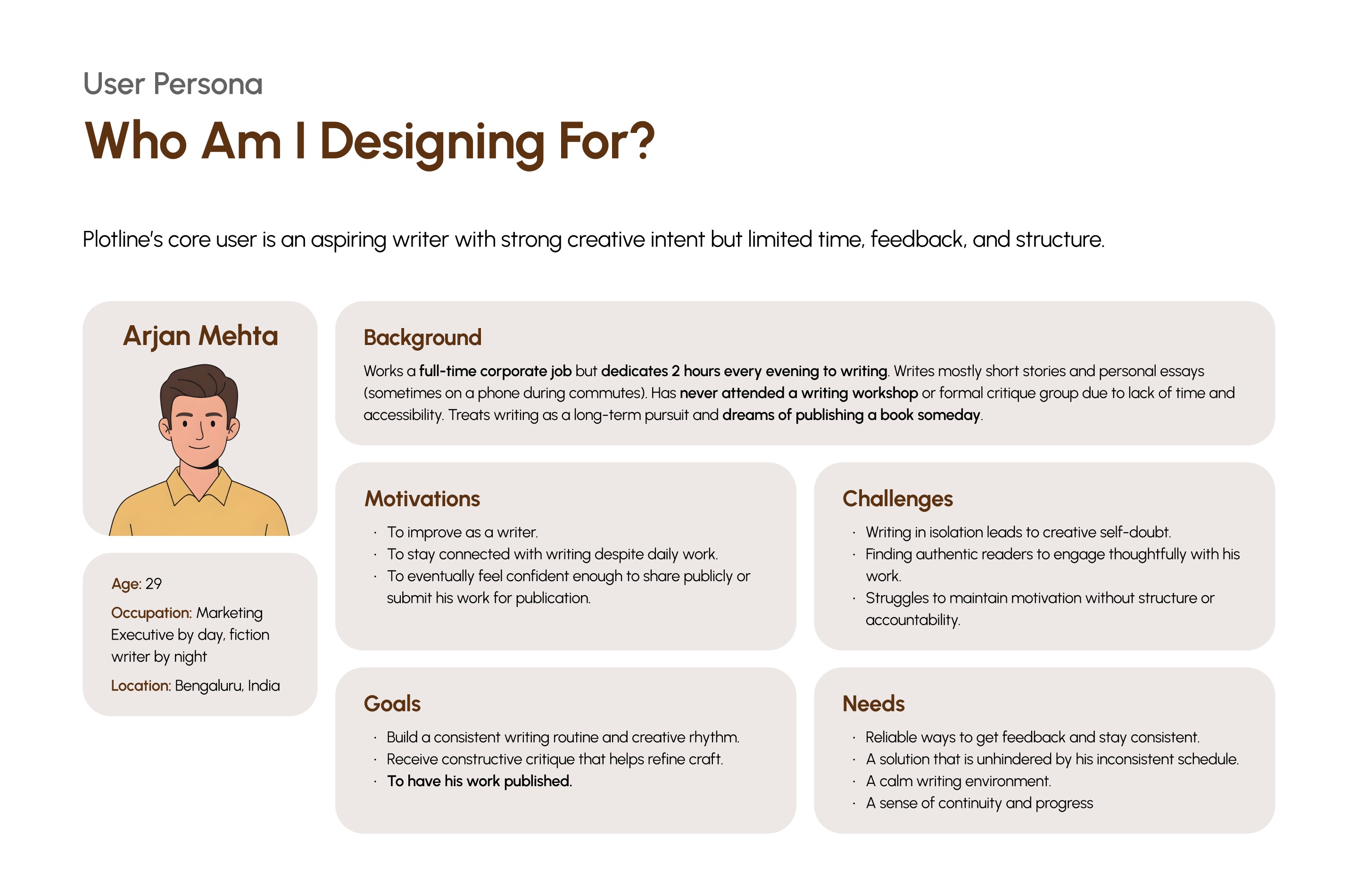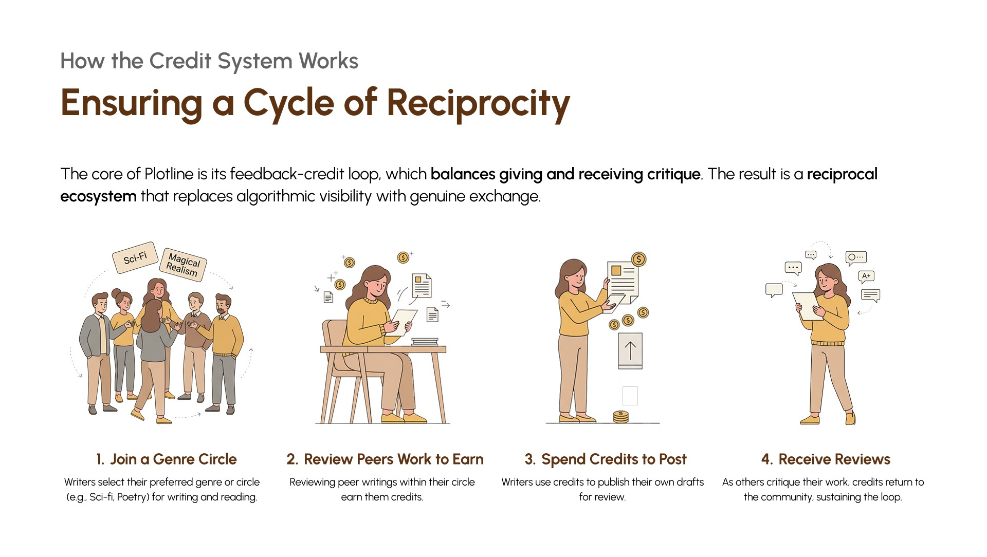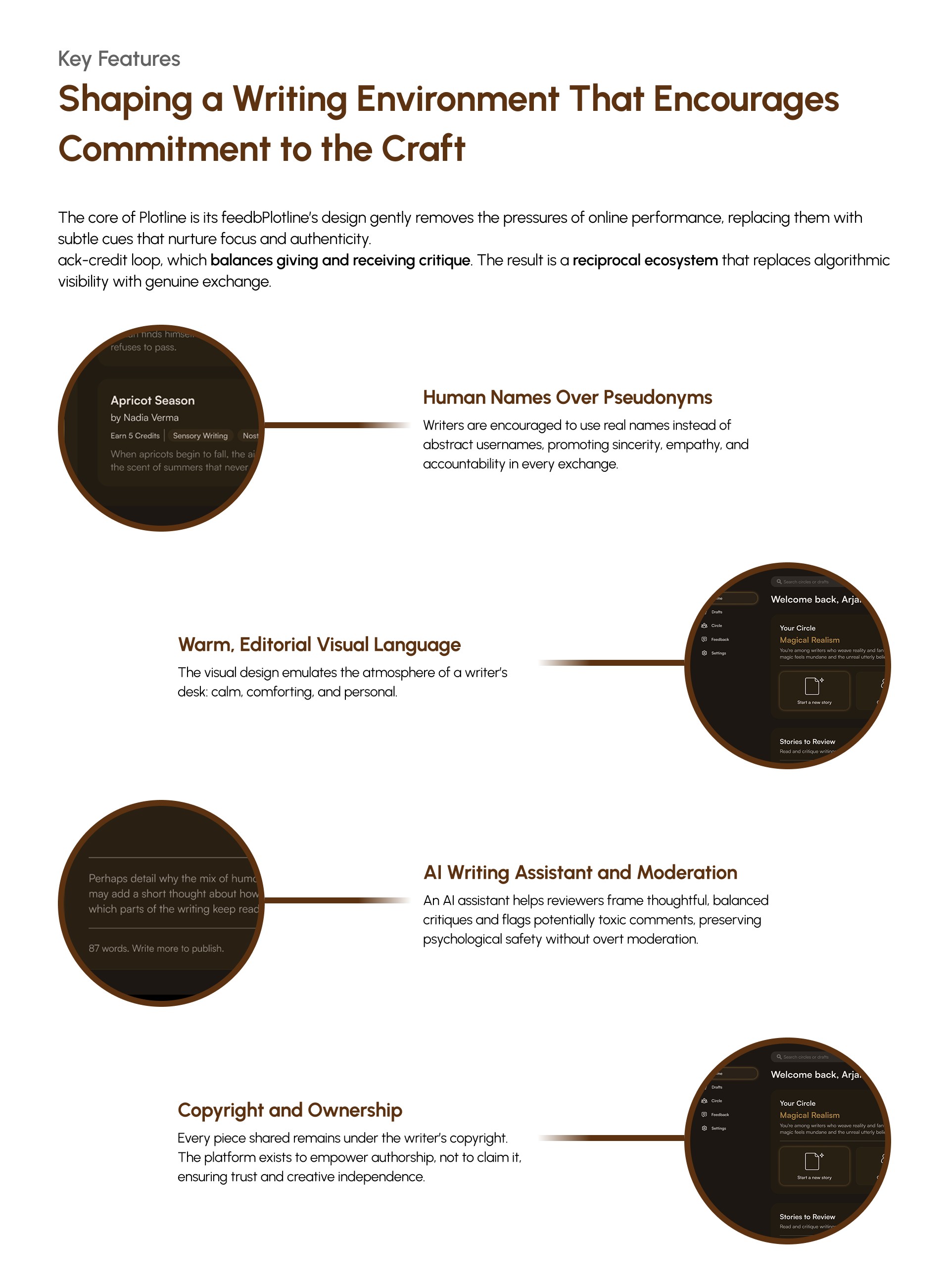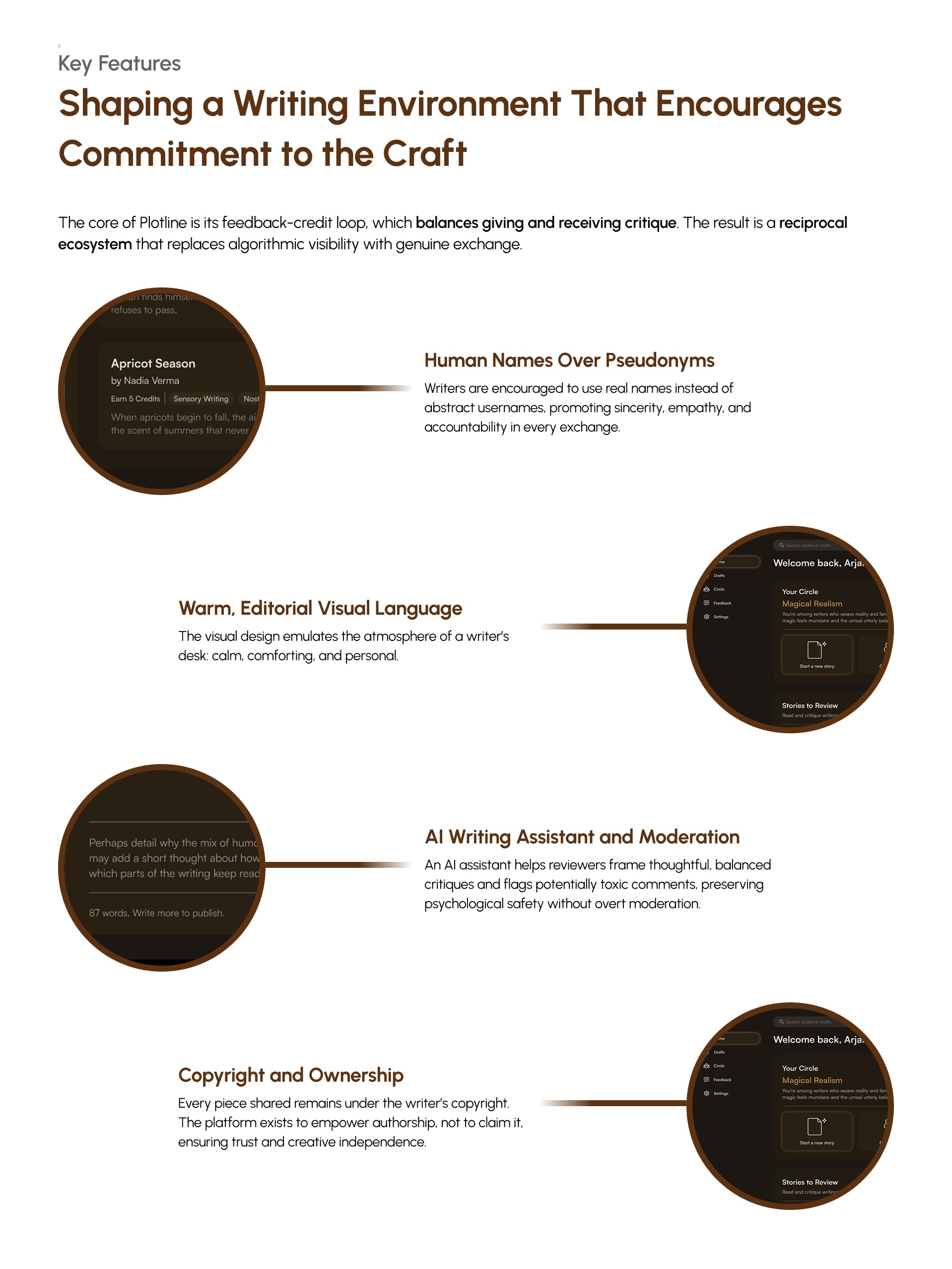 Early-stage writers often write in isolation, without guidance or critique. Plotline creates a feedback-driven community where early-stage writers refine their craft, gain confidence, and develop authentic voice through thoughtful peer exchange.