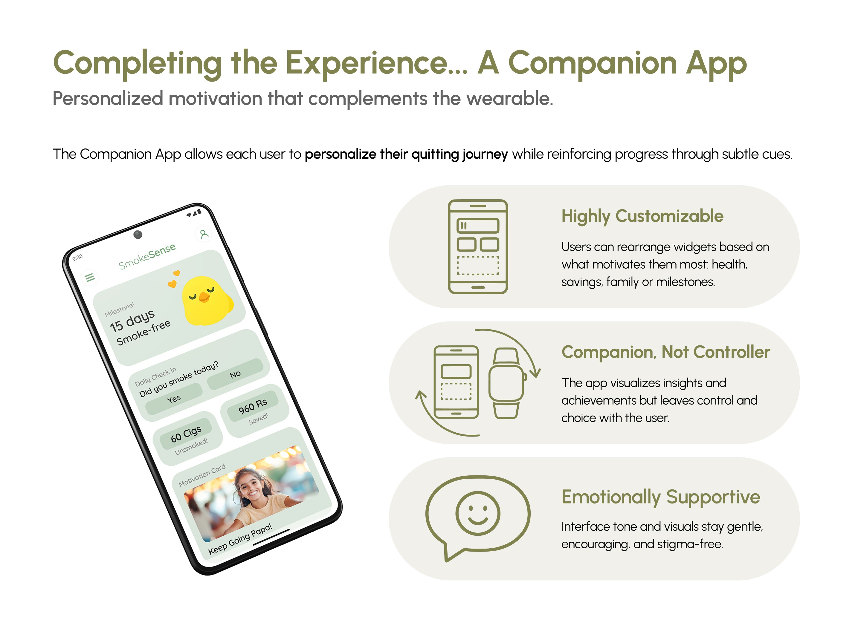 Smoking cessation apps often fail because they rely on tedious self-logging. SmokeSense solves this by seamlessly integrating into everyday wear: a discreet smartwatch attachment that automatically detects smoking through CO and gesture sensing, paired with a companion app that turns raw data into motivating, personalized insights.